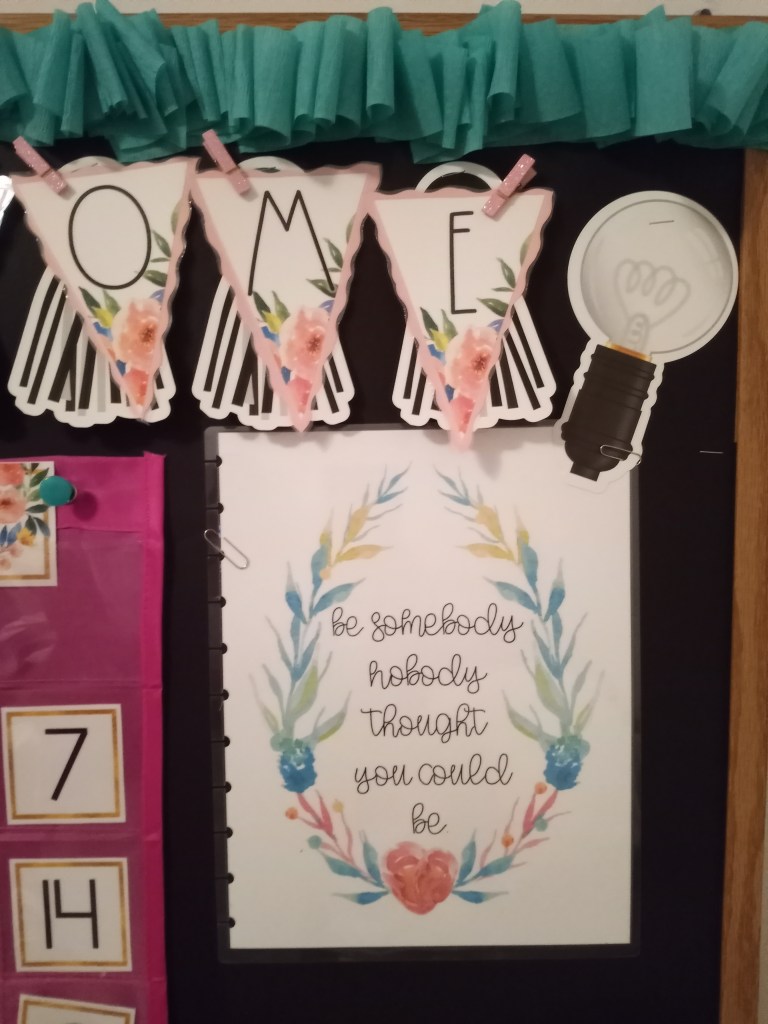 I thought the lightbulb cut-out accent from Schoolgirl Style would be a fun way to draw attention to this quote I downloaded from Teachers Pay Teachers. I usually keep this quote in my teacher planner, but I like that my students will be able to see it now.