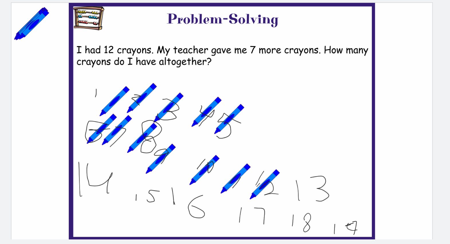 To begin, I had my student read the problem silently to herself. I followed by having her read the problem aloud to me. We talked about what information the problem gave us. I asked my student how many crayons does the person in the problem start out with. She answered, “12,” and I pointed out that there were some crayon counters that she could use to help show twelve crayons. She moved twelve crayons onto the board. We discussed how mathematicians verify their work, and she labeled the counters to show she was accurate in moving twelve crayons into the workspace. We then discussed what happened next in the story. She told me that the teacher gives seven more crayons. I asked her how she could show that part of the story. I was expecting her to move seven more counters onto the board, but she chose to just write down the numbers. She chose to count on seven more from twelve until she reached nineteen.