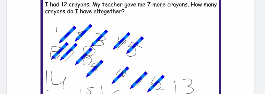 To begin, I had my student read the problem silently to herself. I followed by having her read the problem aloud to me. We talked about what information the problem gave us. I asked my student how many crayons does the person in the problem start out with. She answered, “12,” and I pointed out that there were some crayon counters that she could use to help show twelve crayons. She moved twelve crayons onto the board. We discussed how mathematicians verify their work, and she labeled the counters to show she was accurate in moving twelve crayons into the workspace. We then discussed what happened next in the story. She told me that the teacher gives seven more crayons. I asked her how she could show that part of the story. I was expecting her to move seven more counters onto the board, but she chose to just write down the numbers. She chose to count on seven more from twelve until she reached nineteen.