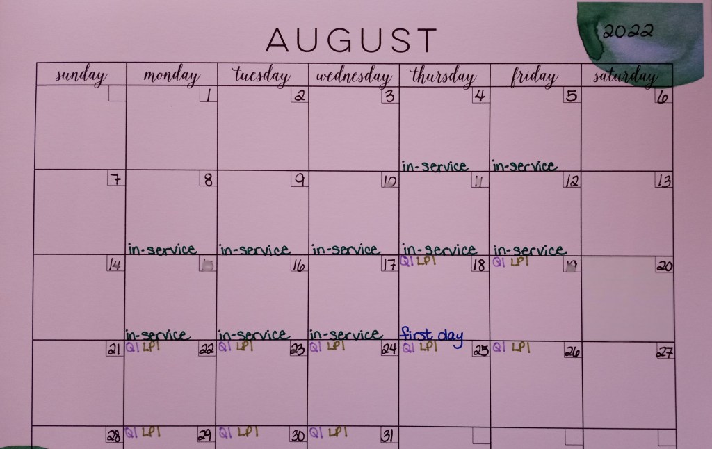 Setting up your monthly calendars is an easy first step toward organization for the next school year. Many schools and school districts determine their instructional calendar well in advance of the upcoming school year and make those calendars available to schools and teachers in the final months of the current school year. In the photo above, I used a calendar set from Everything Just So to map out my August. I color-coded and marked days that I need to remember. My school organizes its instructional time frame by quarters (Q) and learning periods (LP). This information will help me later this summer when I plan my academic calendars for the subjects I teach. I do this for each month of the year, and I include the information I currently have. Testing, vacations, pupil-free days, etc. are marked for each month. These monthly calendars will then be placed in my planner (which I will discuss in greater detail later this summer).